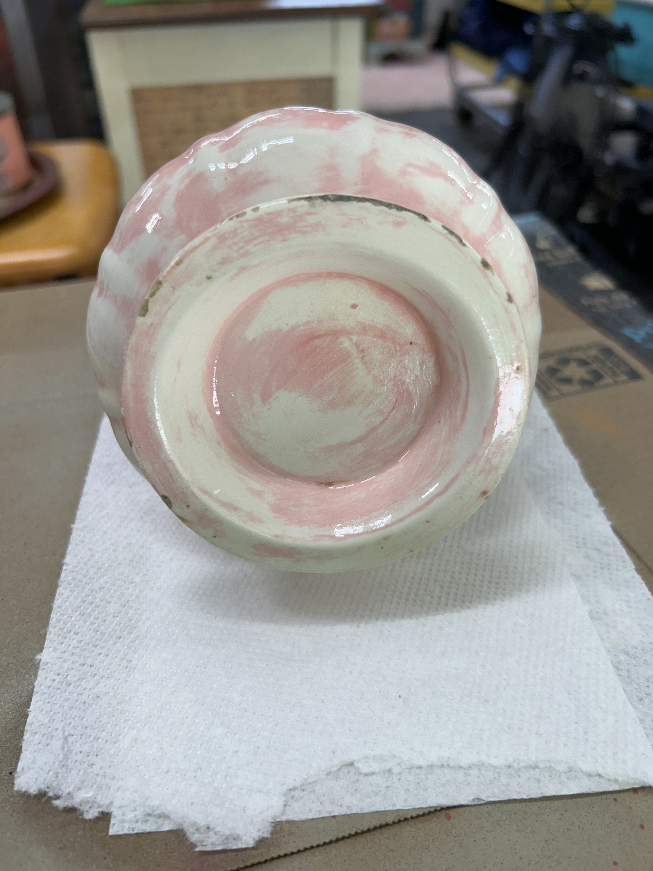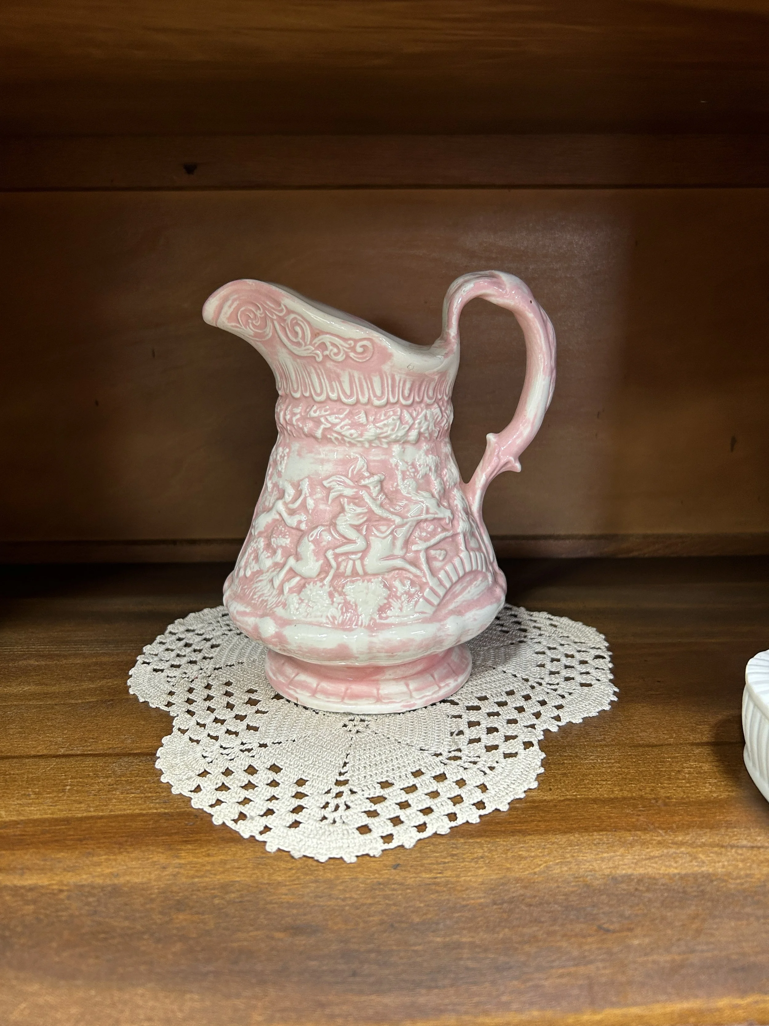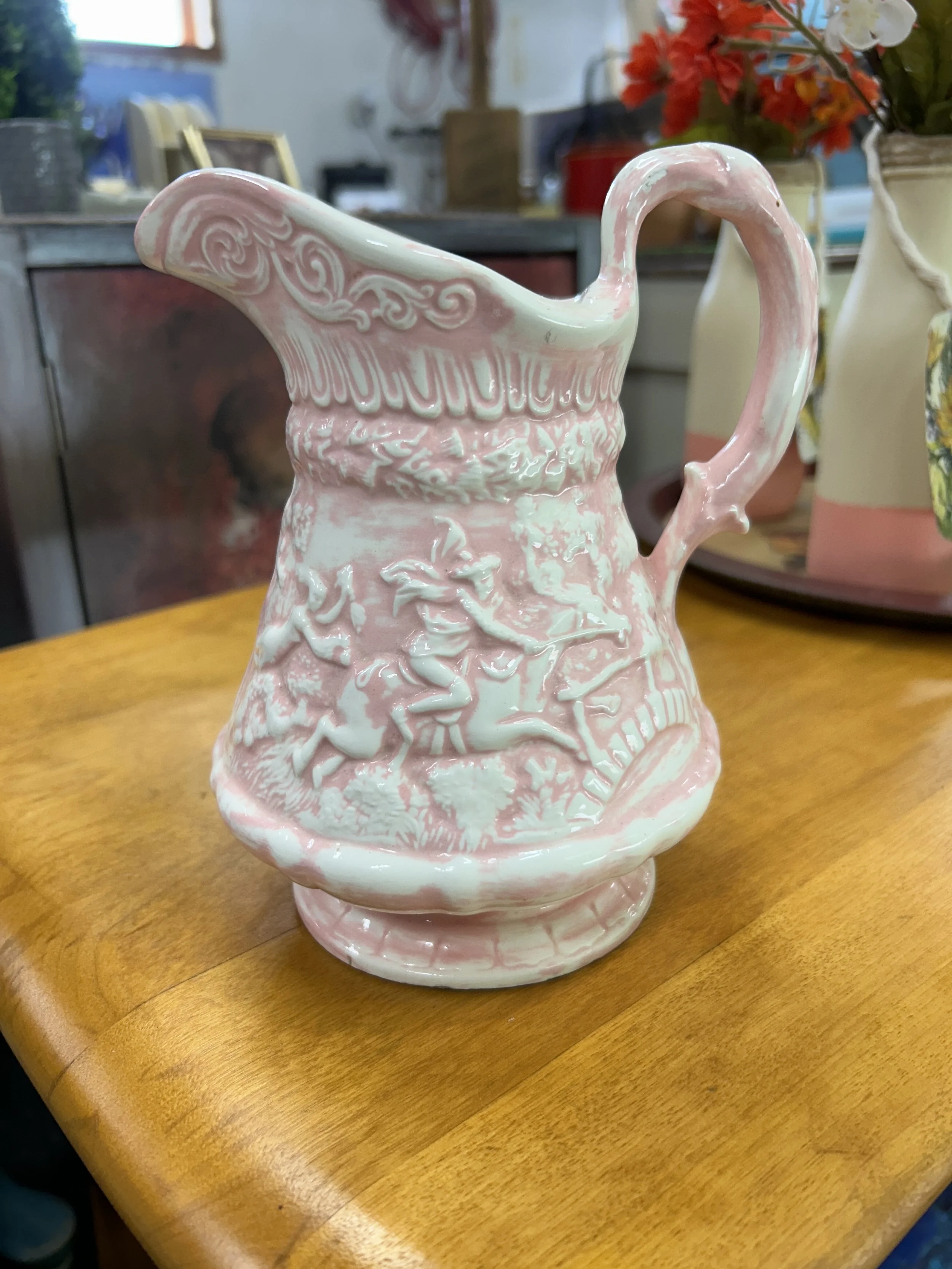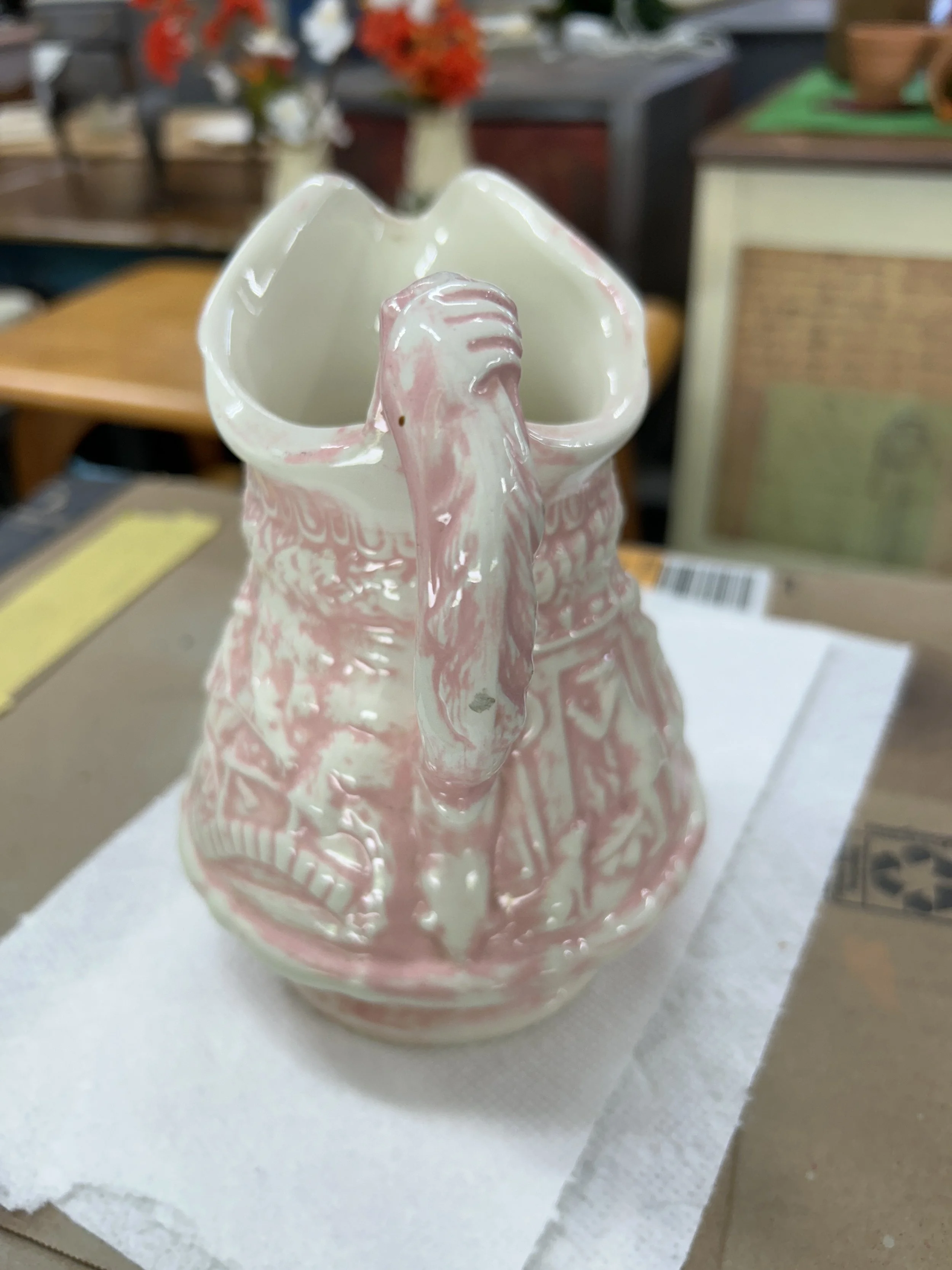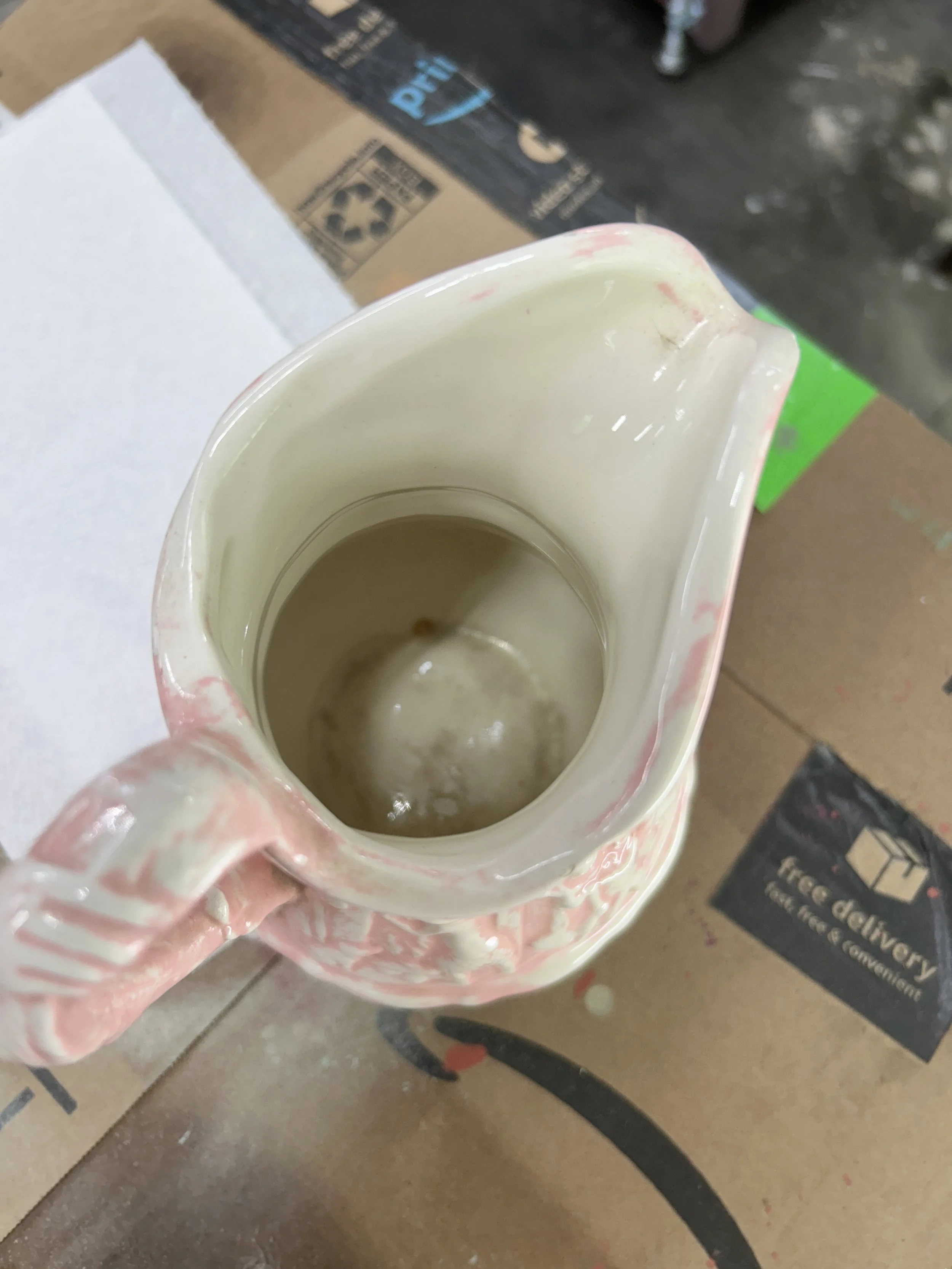 This mid-century magical pitcher is a pale pink & white ironstone. It stands 7.5 inches tall and 5.5 inches at the longest width. The bottom is unmarked and has hints of darkened areas around the edge that reveal the ironstone substance. A small chip is visible on the outer handle, please see photos.